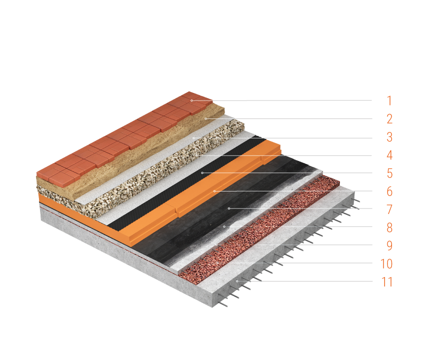 Традиционная эксплуатируемая кровля по железобетонному основанию с покрытием из террасной доски или плитки и гидроизоляцией из ПВХ мембраны